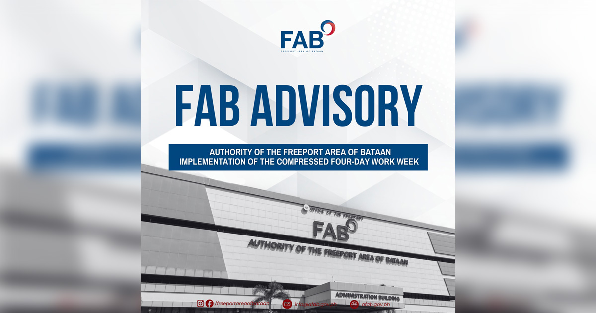 Naglabas ng direktiba si AFAB Administrator at CEO Mohammed Hussein Pangandaman upang ipatupad ang Compressed Four-Day Work Week sa Authority of the Freeport Area of Bataan (AFAB), alinsunod sa Memorandum Circular No. 114 ng Tanggapan ng Pangulo. Sa ilalim ng bagong iskedyul, bukas ang mga tanggapan ng AFAB mula Lunes hanggang Huwebes, alas-7:30 ng umaga hanggang alas-6:30 ng gabi.